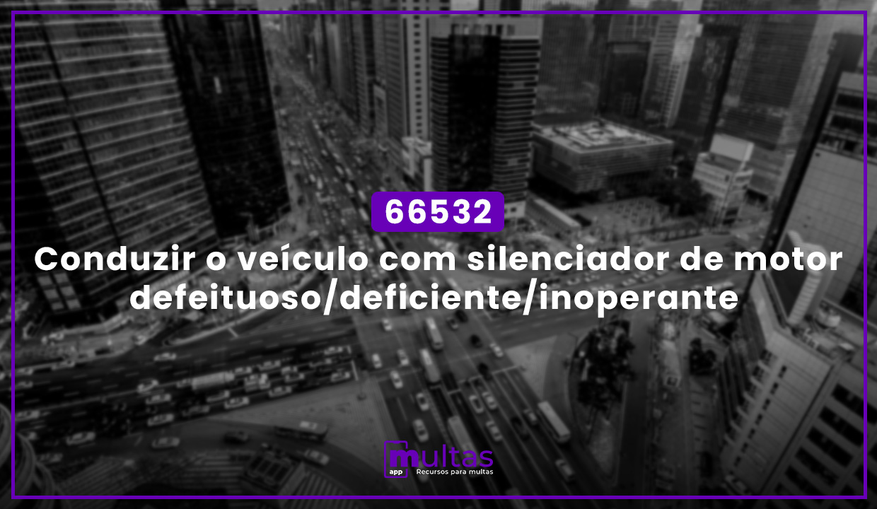 CódigodeTrânsito Brasileiro (CTB), 66532, 230 XI,Conduziroveículocomosilenciadordomotordeexplosãodefeituoso,deficienteouinoperanteOMultasBR analisa e montaorecursodedefesa contra a sua multa no mesmo dia por apenas R$ 39,90.