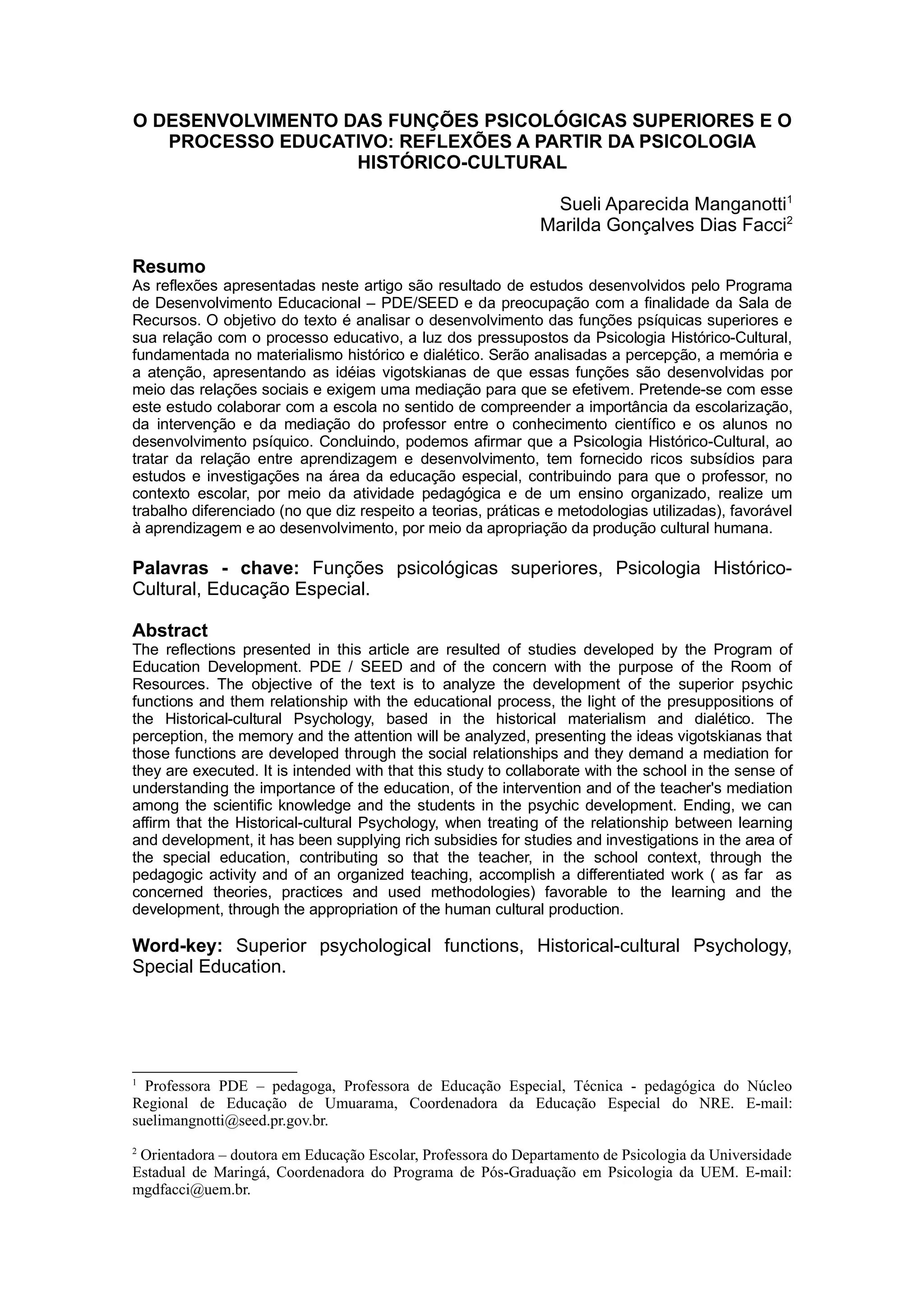 Este artigo é umestudoa respeitodasconcepções do psicólogo, e estudioso multidisciplinar Lev Semenovich Vigotski (1896-1934) sobreoprocesso de desenvolvimentodasfunçõespsicológicassuperiores.