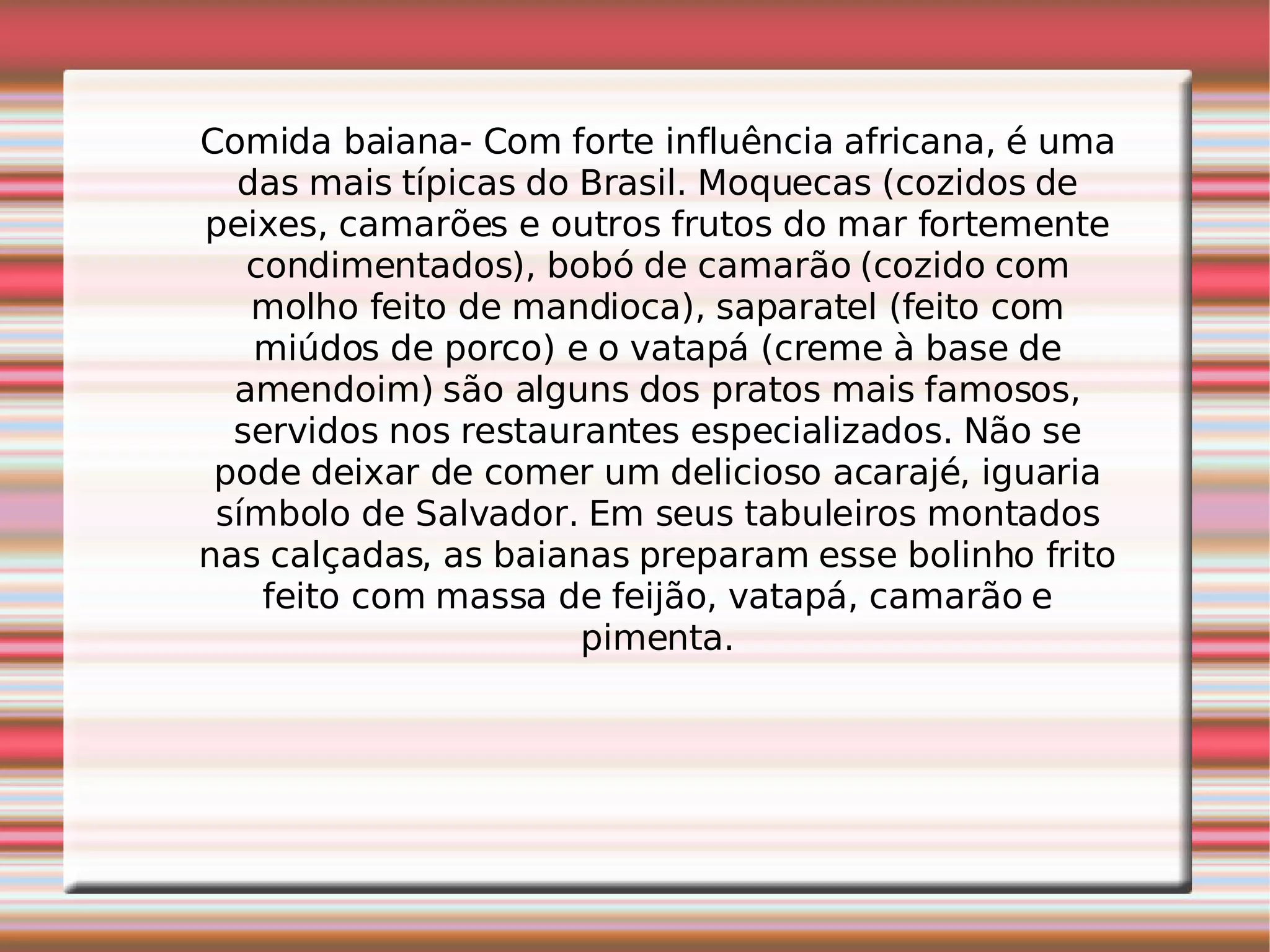 Entreosestadosmais influenciados pela culturaafricanaestão Maranhão, Pernambuco, Alagoas, Bahia, Minas Gerais, Espírito Santo, Rio de Janeiro,SãoPaulo e Rio Grande do Sul.